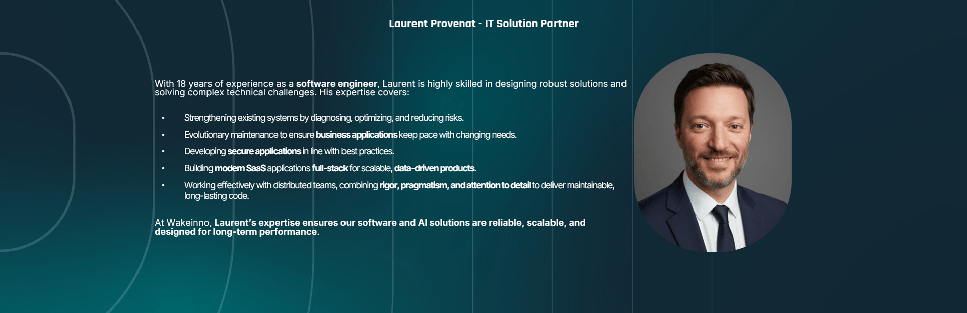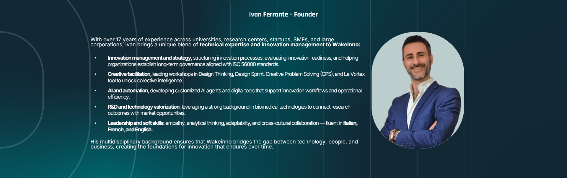 Wakeinno team combines expertises in innovation, business developent, R&D and IT to guide you through transformation — blending the power of proven processes, technology and AI with the essence of what truly drives progress: empathy, listening, and collective intelligence.